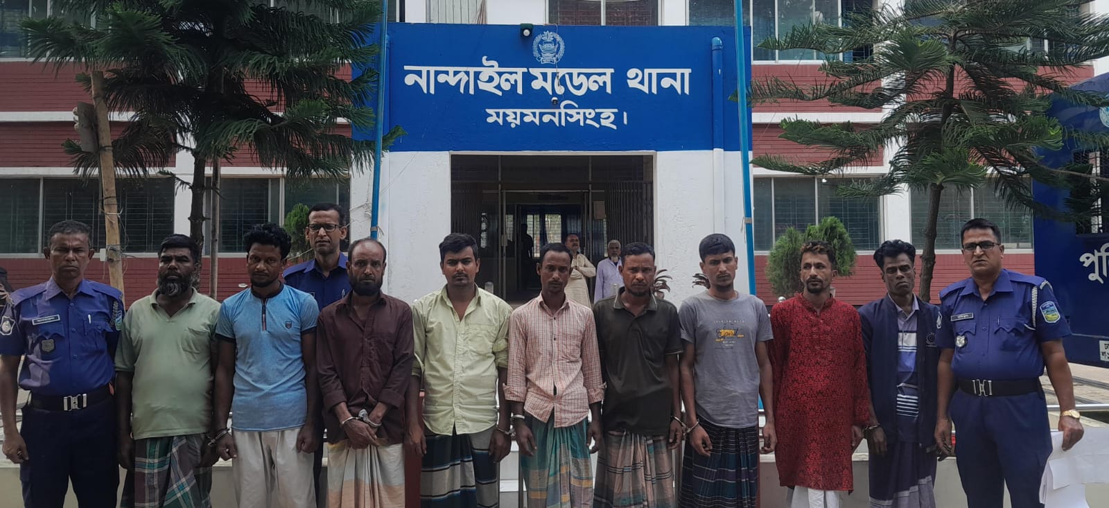 বুধবার (৭ মে) নান্দাইল মডেল থানা পুলিশ কর্তৃক বিশেষ অভিযান পরিচালনা করে নান্দাইল থানার নিয়মিত মাদক মামলা নং ১১(০৫)২৫ ধারা - ৩৬(১) সারনির ১০(ক) উদ্ধার ১৯ (উনিশ) পিচ ইয়াবা ট্যাবলেট এর এজাহারনামীয় আসামি ১৷ কাঞ্চন সরকার (৩৫) ৷ মামলা নং ১০(০৫)২৫ এর গরু চুরি মামলার সন্দিগ্ধ আসামি ২৷ জালাল উদ্দীন উরফে ঝালু (৪০)ও নন এফআই আর নং ৭২/২৫ এর গ্রেফতারকৃত জুয়াড়ি আসামি ৩৷ হাকিম মিয়া (৪২) ৪৷ আসাদ মিয়া (২৫) ৫৷ তমজিদ (৩৩) ৬৷ কুঞ্জন (৪৮) ৭৷ সাফায়েত (৩২) ৮৷ আনোয়ার হোসেন (৩৩) ৯৷ খোকন মিয়া (৩২) গাঙ্গাইল ইউপির সুন্ধাইল গ্রামের জুয়ারি সহ মোট ০৯ (নয়) জন আসামী কে গ্রেফতার করা হয়।