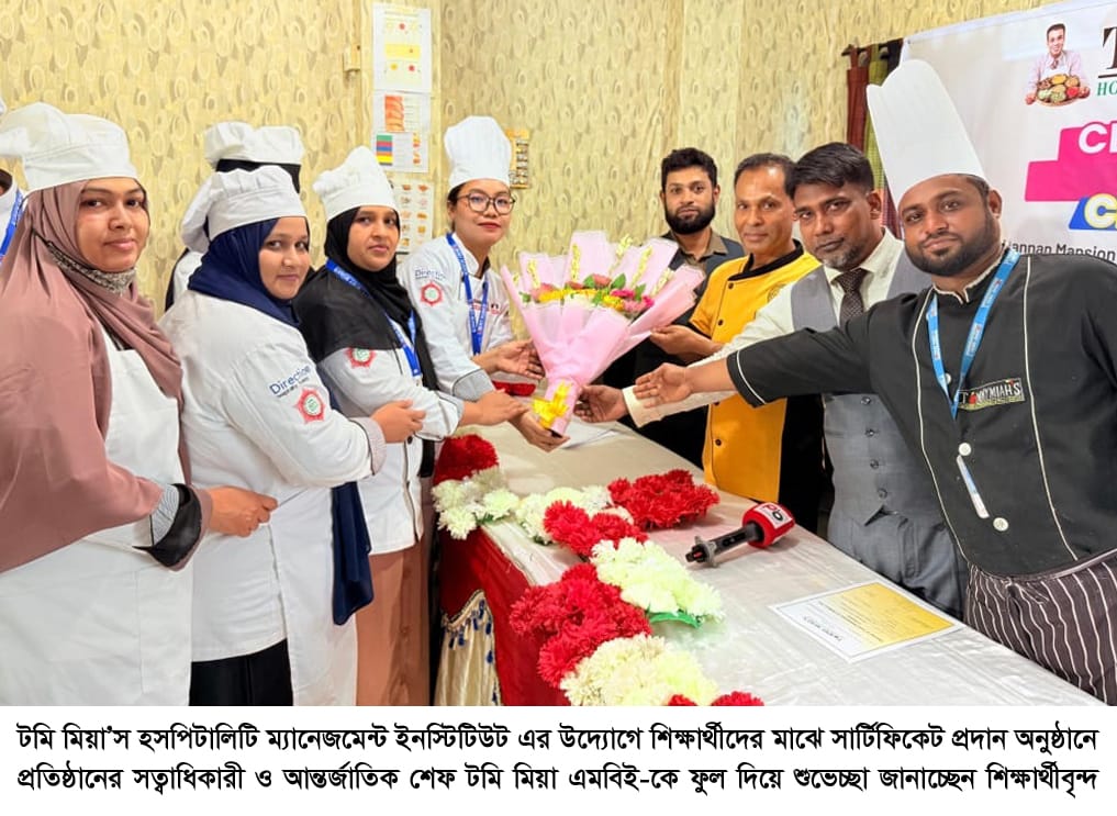 নিজস্ব প্রতিবেদক::সিলেটে বিশ্বমানের রন্ধনশিল্পী প্রশিক্ষণ কেন্দ্র টমি মিয়া’স হসপিটালিটি ম্যানেজমেন্ট ইনস্টিটিউট এ শতাধিক শিক্ষার্থীরকে সনদ প্রদান করা হয় । ১ বছর, ৬ মাস ও ৩ মাস প্রশিক্ষণ শেষে তাদের হাতে এ সনদ তুলে দেয়া হয়। মঙ্গলবার (৫ আগস্ট) দুপুরে সিলেট রিকাবিবাজারস্থ নিজ কার্যালয়ে টমি মিয়া‘স হসপিটালিটি ম্যানেজমেন্ট এর ইনস্টিটিউটে প্রধান অতিথি হিসেবে প্রশিক্ষিত এ শেফদের হাতে সার্টিফিকেট তুলে দেন ইন্সটিটিউটের স্বত্তাধীকারী টমি মিয়া এমবিই।