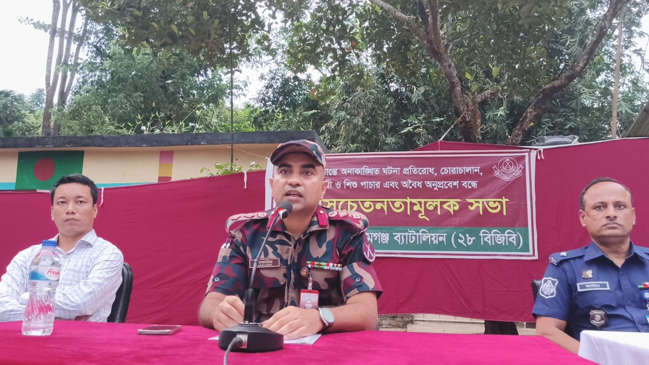 এম ডি ফারুক মিয়া, দোয়ারাবাজার (সুনামগঞ্জ) প্রতিনিধি:: সুনামগঞ্জের দোয়ারাবাজার উপজেলার সীমান্তবর্তী বাংলাবাজার বাশতলা এলাকায় অনুষ্ঠিত এক জনসচেতনতামূলক সভায় ২৮ বিজিবি সুনামগঞ্জ ব্যাটালিয়নের অধিনায়ক লেফটেন্যান্ট কর্নেল এ কে এম জাকারিয়া কাদির